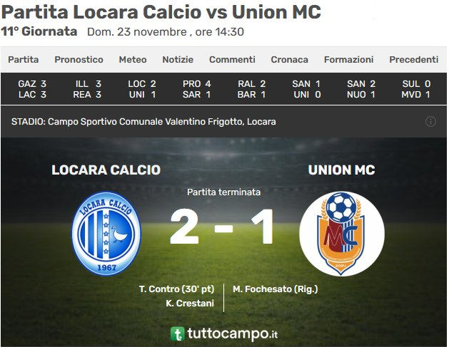 A.S.D. Locara Calcio23 nov 2025Tempo di lettura: 1 minValutazione NaN stelle su 5.Campionato 2^cat.gir.D 11^ giornata 23 Nov. '25Locara Calcio: 2Union MC: 1